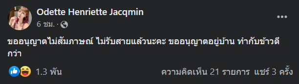 ล่าสุด (28 มี.ค. 65) มีความเคลื่อนไหวบนเฟซบุ๊กของ โอเด็ต เฮนเรียต แจ็คโคมิน อีกครั้ง เมื่อเจ้าตัวได้ลบโพสต์ก่อนหน้านี้ที่เกี่ยวกับ ต.ม. ออกทั้งหมด ก่อนจะโพสต์ข้อความระบุว่า…