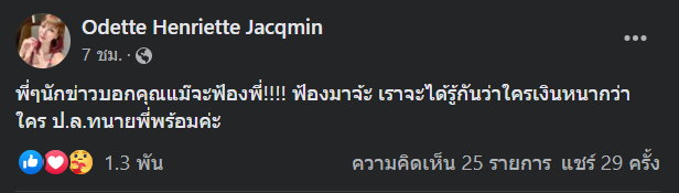 ต่อมา โอเด็ต ก็ได้โพสต์ข้อความอีกครั้งถัดจากโพสต์ก่อนหน้านี้ โดยบอกว่า ‘พี่ ๆ นักข่าวบอกคุณแม๊จะฟ้องพี่! ฟ้องมาจ้ะ เราจะได้รู้กันว่าใครเงินหนากว่าใคร ป.ล.ทนายพี่พร้อมค่ะ’