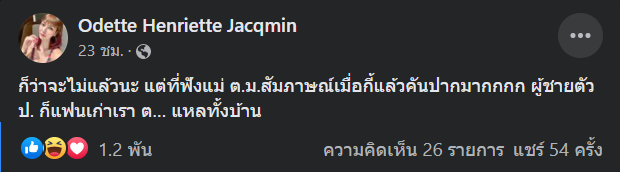 ด้านนางแบบชื่อดัง โอเด็ต ก็ได้ออกมาโพสต์ข้อความผ่านทางเฟซบุ๊กส่วนตัว ระบุว่า ‘ก็ว่าจะไม่แล้วนะ แต่ที่ฟังแม่ ต.ม. สัมภาษณ์เมื่อกี้แล้วคันปากมาก ผู้ชายตัว ป. ก็แฟนเก่าเรา ต…แหลทั้งบ้าน’