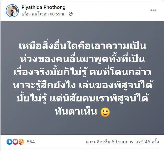 ล่าสุด (13 ตุลาคม 2563) ออย ปิยธิดา หนึ่งในผู้เข้าประกวด Miss Universe Thailand 2020 ก็ออกมาโพสต์เฟซบุ๊กว่า “เหนือสิ่งอื่นใดคือเอาความเป็นห่วงของคนอื่นมาพูดทั้งที่เป็นเรื่องจริงมั้ยก็ไม่รู้ คนที่โดนกล่าวหาจะรู้สึกยังไง เล่นของพิสูจน์ได้มั้ยไม่รู้ เเต่นิสัยคนเราพิสูจน์ได้ทันตาเห็น”