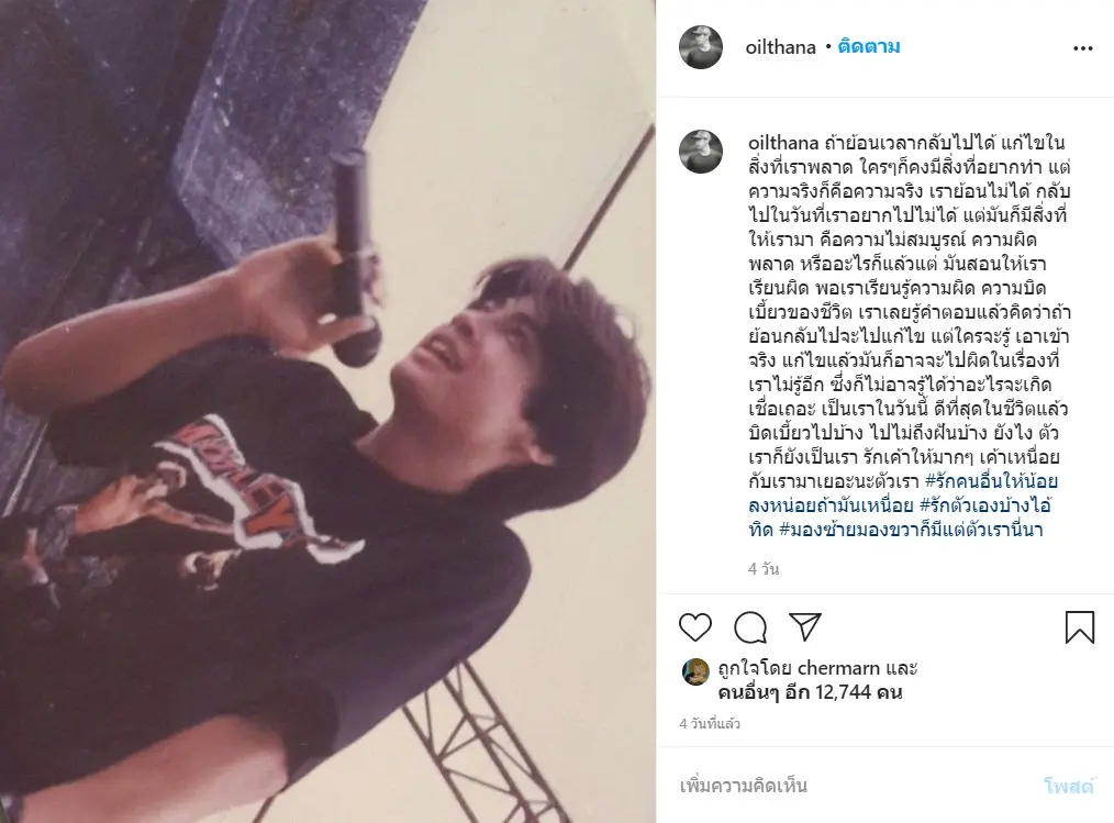 เรียกได้ว่า นานๆทีจะออกมาอัปเดตโซเชียล สำหรับ ออย ธนา นักร้อง-นักแสดงยุค 90s ชื่อดัง ที่ล่าสุดเจ้าตัวออกมาโพสต์ภาพสมัยตนเองหนุ่มๆ พร้อมกับเผยข้อความว่า “ถ้าย้อนเวลากลับไปได้ แก้ไขในสิ่งที่เราพลาด ใครๆก็คงมีสิ่งที่อยากทำ แต่ความจริงก็คือความจริง เราย้อนไม่ได้ กลับไปในวันที่เราอยากไปไม่ได้ แต่มันก็มีสิ่งที่ให้เรามา คือความไม่สมบูรณ์ ความผิดพลาด หรืออะไรก็แล้วแต่ มันสอนให้เราเรียนผิด พอเราเรียนรู้ความผิด ความบิดเบี้ยวของชีวิต เราเลยรู้คำตอบแล้วคิดว่าถ้าย้อนกลับไปจะไปแก้ไข แต่ใครจะรู้ เอาเข้าจริง แก้ไขแล้วมันก็อาจจะไปผิดในเรื่องที่เราไม่รู้อีก ซึ่งก็ไม่อาจรู้ได้ว่าอะไรจะเกิด เชื่อเถอะ เป็นเราในวันนี้ ดีที่สุดในชีวิตแล้ว บิดเบี้ยวไปบ้าง ไปไม่ถึงฝันบ้าง ยังไง ตัวเราก็ยังเป็นเรา รักเค้าให้มากๆ เค้าเหนื่อยกับเรามาเยอะนะตัวเรา #รักคนอื่นให้น้อยลงหน่อยถ้ามันเหนื่อย #รักตัวเองบ้างไอ้ทิด #มองซ้ายมองขวาก็มีแต่ตัวเรานี่นา”