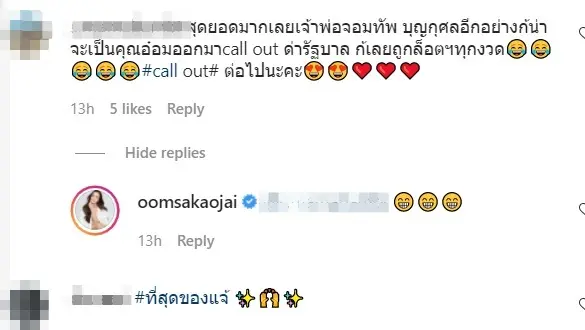 งานนี้ทำเอาแฟนๆแห่เข้ามาคอมเมนต์ยินดี และแซวกันแทบไม่หยุดเพราะเธอเป็นอีกคนบันเทิงที่มักจะออกมา Call Out ทางการเมืองอยู่หลายครั้ง โดยเธอยังโดนแซวไปอีกว่า