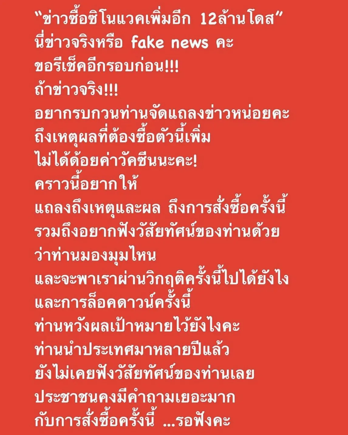 ข่าวซื้อซิโนแวคเพิ่มอีก 12ล้านโดส นี่ข่าวจริงหรือ fake news คะ ขอรีเช็คอีกรอบก่อน!!! ถ้าข่าวจริง!!! อยากรบกวนท่านจัดแถลงข่าวหน่อยค่ะ ถึงเหตุผลที่ต้องซื้อตัวนี้เพิ่ม ไม่ได้ด้อยค่าวัคซีนนะคะ! คราวนี้อยากให้ แถลงถึงเหตุและผล ถึงการสั่งซื้อครั้งนี้ รวมถึงอยากฟังวิสัยทัศน์ของท่านด้วยว่าท่านมองมุมไหนและจะพาเราผ่านวิกฤติครั้งนี้ไปได้ยังไง และการล็อกดาวน์ครั้งนี้ ท่านหวังผลเป้าหมายไว้ยังไงคะ ท่านนำประเทศมาหลายปีแล้ว ยังไม่เคยฟังวิสัยทัศน์ของท่านเลย ประชาชนคงมีคำถามเยอะมากกับการสั่งซื้อครั้งนี้ …รอฟังค่ะ