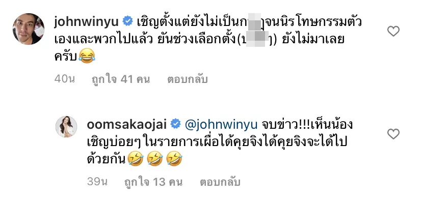 จนทางด้านของ จอห์น วิญญู ก็ได้เข้ามาคอมเมนต์ใต้โพสต์ของ อ๋อม ว่า เชิญ “ลุง” มาตั้งนานแล้ว จนตอนนี้ก็ยังไม่ยอมมาคุยด้วยเลย