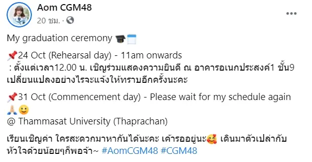 นาทีนี้ต้องขอแสดงความยินดีกับสาวน้อยน่ารัก ตำแหน่งหัวหน้าวงอย่าง ออมCGM48 ที่กำลังจะเข้าร่วมพิธีรับปริญญาบัตรในปลายเดือนนี้ โดยเจ้าตัวได้ออกมาเชิญชวนให้แฟนๆ ไปร่วมถ่ายรูปแสดงความยินดีด้วยกันผ่านโพสต์ทาง Facebook ส่วนตัว ในวันที่ 24 ตุลาคม ที่มหาวิยาลัยธรรมศาสตร์ แคมปัสท่าพระจันทร์ ตั้งแต่เวลา 12.00 เป็นต้นไป รวมไปถึงในวันที่ 31 ตุลาคม ซึ่งเจ้าตัวจะมาบอกรายละเอียดภายหลัง โดยไอดอลสาวคนนี้ได้เรียนจบมาจากคณะคณะวิทยาศาสตร์และเทคโนโลยี สาขาวิทยาการประกันภัย มหาวิทยาลัยธรรมศาสตร์ ด้วยเกียรตินิยมอันดับ 1 ภายในระยะเวลาการเรียนเพียง 3 ปีครึ่งเท่านั้นเอง ต้องเรียกได้ว่าแคปออมคนนี้ทั้งเก่ง และสวยจริงๆ เหล่าโอตะคงจะเป็นปลื้มกันไปถ้วนหน้า