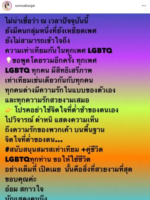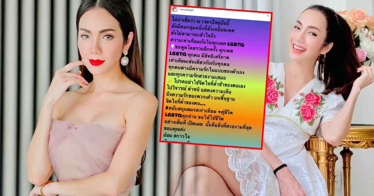 อ๋อม สกาวใจ ออกมาเป็นพลังเสียงอีกแรงกับความเท่าเที่ยมทางเพศ พร้อมฟาดคนบางกลุ่มที่ยังเหยียด LGBTQ ย่าใช้จิตใจที่ต่ำตัวเองไปวิจารณ์