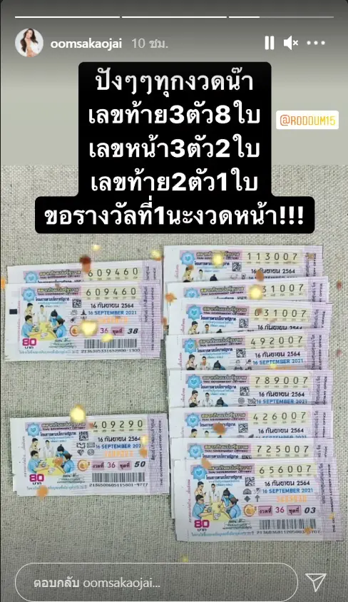 งวดนี้อ๋อมเองก็ไม่น้อยหน้า กวาดไปทั้งสิ้น 11 ใบ! จากทั้งหมด 25ใบ มีทั้ง 3ตัวหน้า 3ตัวท้าย และ 2ตัวท้าย ทำเอาชาวเน็ตต่างก็อิจฉาเจ้าตัวที่มีลูกชายค่อยให้เลขเด็ดอยู่เสมอๆเลย
