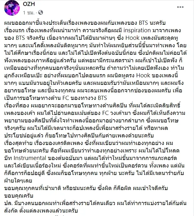 “ผมขอออกมาชี้แจงประเด็นเรื่องเพลงของผมกับเพลงของ BTS นะครับ เรื่องแรก เรื่องเพลงที่ผมนำมาทำ ความจริงคือผมมี inspiration มาจากเพลงของ BTS จริงครับ เนื่องจากผมไปได้ยินมาผ่านๆ ซึ่ง Hook เพลงมันสะดุดหูมากๆ และเมโลดี้เพลงมันติดหูมากๆ มันทำให้ผมหยิบส่วนนี้ขึ้นมาทำเพลง โดยไม่ได้ศึกษาเรื่องนี้ก่อน และไม่ได้ไปเปิดฟังต้นฉบับนี้ก่อน ซึ่งปกติผมไม่ค่อยได้ฟังเพลงของเกาหลีอยู่แล้วครับ แต่พอมามีกระแสดราม่า ผมก็เข้าไปเปิดฟัง ก็เหมือนอย่างที่ทุกคนบอกจริงๆนั่นแหละครับ ถ้าถามว่าไม่เคยเปิดฟังเอง ทำไมฮุกถึงเหมือนเป๊ะ อย่างที่ผมบอกไปตอนแรก ผมนิดหูตรง Hook ของเพลงนี้มากๆ แบบมันวนอยู่ในหัวเลยครับ และผมยอมรับว่ามันเหมือนมากๆ และผมจึงอยากขอโทษ และชี้แจงทุกคน ผมจะลบเพลงนี้ออกจากช่องของผมครับ เพื่อเป็นการขอโทษทางด้าน FC ของทางวง BTS เรื่องที่สอง ผมอยากจะออกมาขอโทษทางด้านศิลปิน ที่ผมได้ละเมิดลิขสิทธิ์เพลงของเค้า ผมได้ไปอ่านคอมเม้นต์ของ FC วงเค้ามา ซึ่งผมก็ได้เห็นถึงความพยายามของศิลปินที่ตั้งใจทำเพลงนี้ออกมาอย่างยากลำบาก ซึ่งผมขอโทษจริงๆครับ ผมไม่ได้มีเจตนาจะก็อปเพลงนี้เพื่อมาสร้างรายได้ หรือหาผลประโยชน์อยู่แล้ว ก็ขอโทษไปทางศิลปินกับค่ายเพลงด้วยนะครับ เรื่องสุดท้าย เรื่องของเครดิตเพลง ซึ่งที่ผมเขียนว่าผมทำเองทุกอย่าง ผมขอโทษด้วยนะครับ คือที่ผมเขียนว่าทำเองทุกอย่างเพราะ ผมไม่ได้ไปโหลดบีท Instrumental ของต้นฉบับมา แต่ผมได้ทำใหม่ขึ้นมาจากการแกะคอร์ด และได้เขียนเนื้อร้องใหม่ ซึ่งคอร์ดที่ผมทำขึ้นใหม่เป็นคอร์ดวน ทั้งเพลง แต่มันก็คือการก็อปอยู่ดี ซึ่งผมก็ขอโทษทุกคน ทุกฝ่าย นะครับ ไม่ได้มีเจตนาร้ายกับฝ่ายใดๆเลย ขอบคุณทุกคนที่เข้ามาติ หรือชมนะครับ ซึ่งผิด ก็คือผิด ผมเข้าใจดีครับ ขอบคุณครับ ปล. มีบางคนบอกผมทำเพื่อสร้างรายได้คนเดียว ผมได้ทำการแบ่งรายได้กับต้นสังกัด ตั้งแต่ลงเพลงแล้วนะครับ ขอบคุณทุกคนมากๆครับ by OZH”
