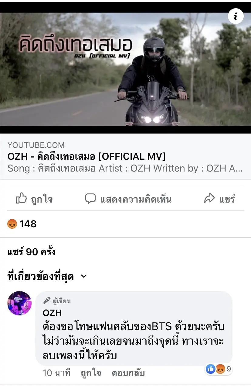 หลังจากที่มีดราม่าการละเมิดลิขสิทธิ์เพลงของ วง BTS สำหรับเพลง “คิดถึงเสมอ” ของวง OZH ที่ทำเพลงออกมาทำนองคล้ายเพลง Epiphany ซึ่งเป็นเพลงของ Jin หนึ่งในสมาชิกของวงและเป็นพี่ใหญ่แห่งวง BTS นั้นเอง ล่าสุดเพจ OZH ได้ออกมาขอโทษที่ได้ละเมิดลิขสิทธิ์เพลงของ วง BTS ว่า