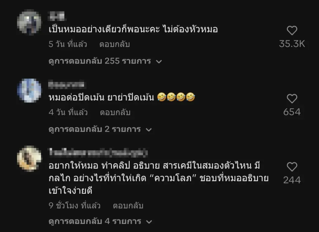 “อยากให้หมอทำคลิปอธิบายสารเคมีในสมองตัวไหน มีกลไกอย่างไรที่ทำให้เกิด ‘ความโลภ’ ชอบที่หมออธิบายเข้าใจง่ายดี”