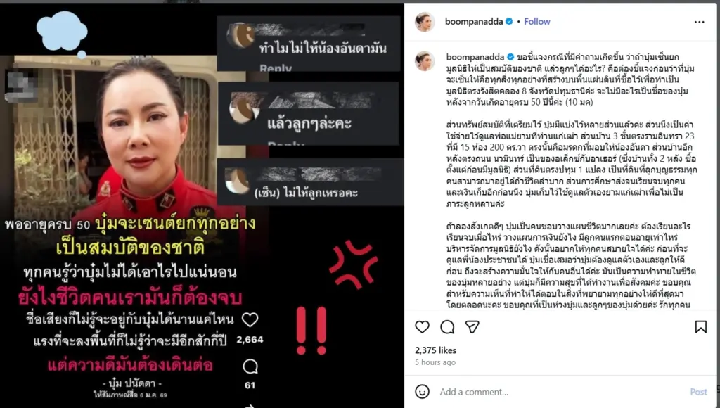 หลังถูกชาวเน็ตตั้งคำถามแรง “ทำไมไม่ยกทรัพย์ให้ลูก” บุ๋ม ปนัดดา ออกมาชี้แจงละเอียด ยืนยันทรัพย์ที่ยกให้เป็นของมูลนิธิเท่านั้น ส่วนลูกๆ วางแผนดูแลไว้ครบ บ้าน ที่ดิน การศึกษา และอนาคต ไม่ทิ้งใครไว้ข้างหลัง