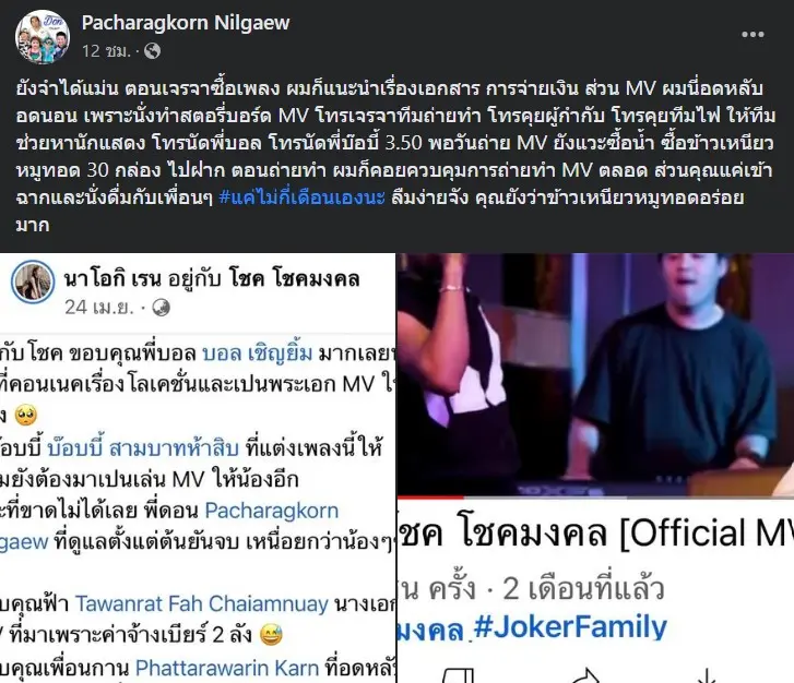 ต่อมาเฟซบุ๊ก Pacharagkorn Nilgaew ได้แชร์โพสต์ดังกล่าวของบอล พร้อมแคปชั่นว่า ยังจำได้แม่น ตอนเจรจาซื้อเพลง ผมก็แนะนำเรื่องเอกสาร การจ่ายเงิน ส่วน MV ผมนี่อดหลับอดนอน เพราะนั่งทำสตอรี่บอร์ด MV โทรเจรจาทีมถ่ายทำ โทรคุยผู้กำกับ โทรคุยทีมไฟ ให้ทีมช่วยหานักแสดง โทรนัดพี่บอล โทรนัดพี่บ๊อบี้ 3.50 พอวันถ่าย MV ยังแวะซื้อน้ำ ซื้อข้าวเหนียวหมูทอด 30 กล่อง ไปฝาก ตอนถ่ายทำ ผมก็คอยควบคุมการถ่ายทำ MV ตลอด ส่วนคุณแค่เข้าฉากและนั่งดื่มกับเพื่อนๆ #แค่ไม่กี่เดือนเองนะ ลืมง่ายจัง คุณยังว่าข้าวเหนียวหมูทอดอร่อยมาก