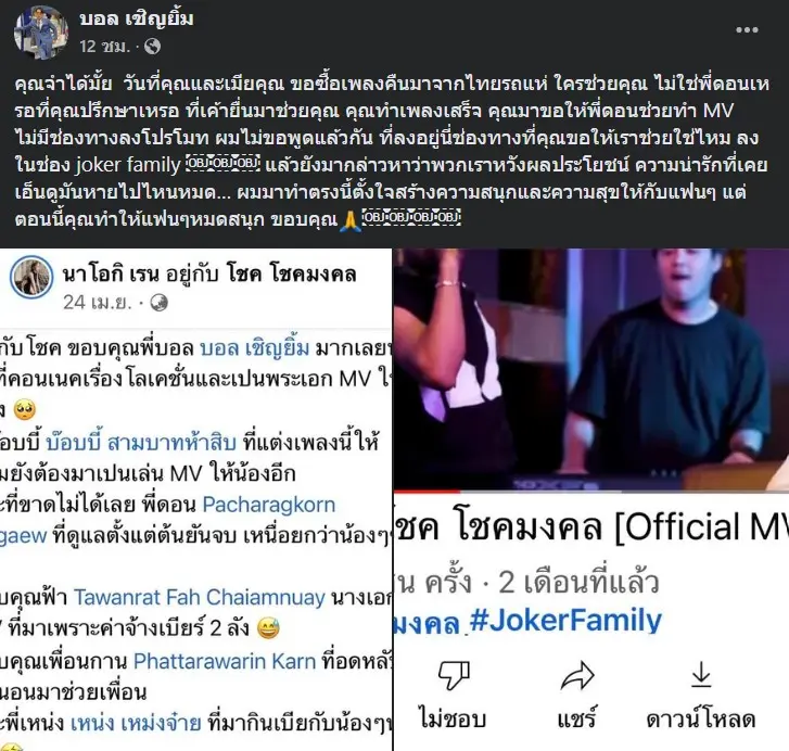 ล่าสุดบอลได้อกมาเคลื่อนไหวอีกครั้งหลัง โชค เทงานกว่า 50 คิวว่า คุณจำได้มั้ย วันที่คุณและเมียคุณ ขอซื้อเพลงคืนมาจากไทยรถแห่ ใครช่วยคุณ ไม่ใช่พี่ดอนเหรอที่คุณปรึกษาเหรอ ที่เค้ายื่นมาช่วยคุณ คุณทำเพลงเสร็จ คุณมาขอให้พี่ดอนช่วยทำ MV ไม่มีช่องทางลงโปรโมท ผมไม่ขอพูดแล้วกัน ที่ลงอยู่นี่ช่องทางที่คุณขอให้เราช่วยใช่ไหม ลงในช่อง joker family แล้วยังมากล่าวหาว่าพวกเราหวังผลประโยชน์ ความน่ารักที่เคยเอ็นดูมันหายไปไหนหมด… ผมมาทำตรงนี้ตั้งใจสร้างความสนุกและความสุขให้กับแฟนๆ แต่ตอนนี้คุณทำให้แฟนๆหมดสนุก ขอบคุณ