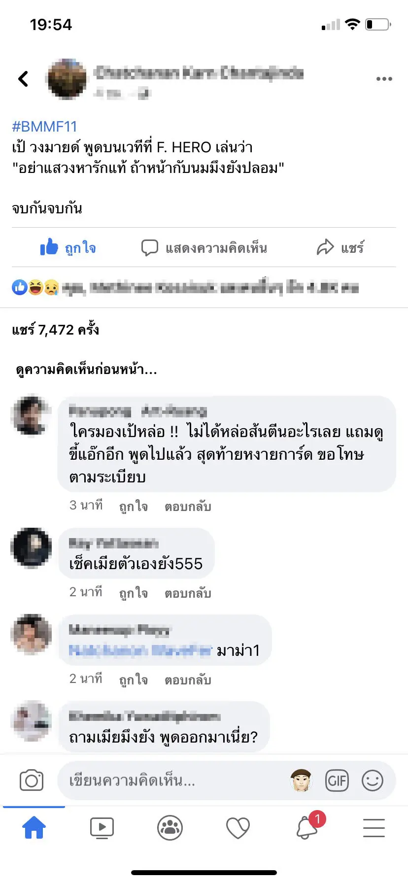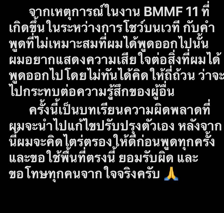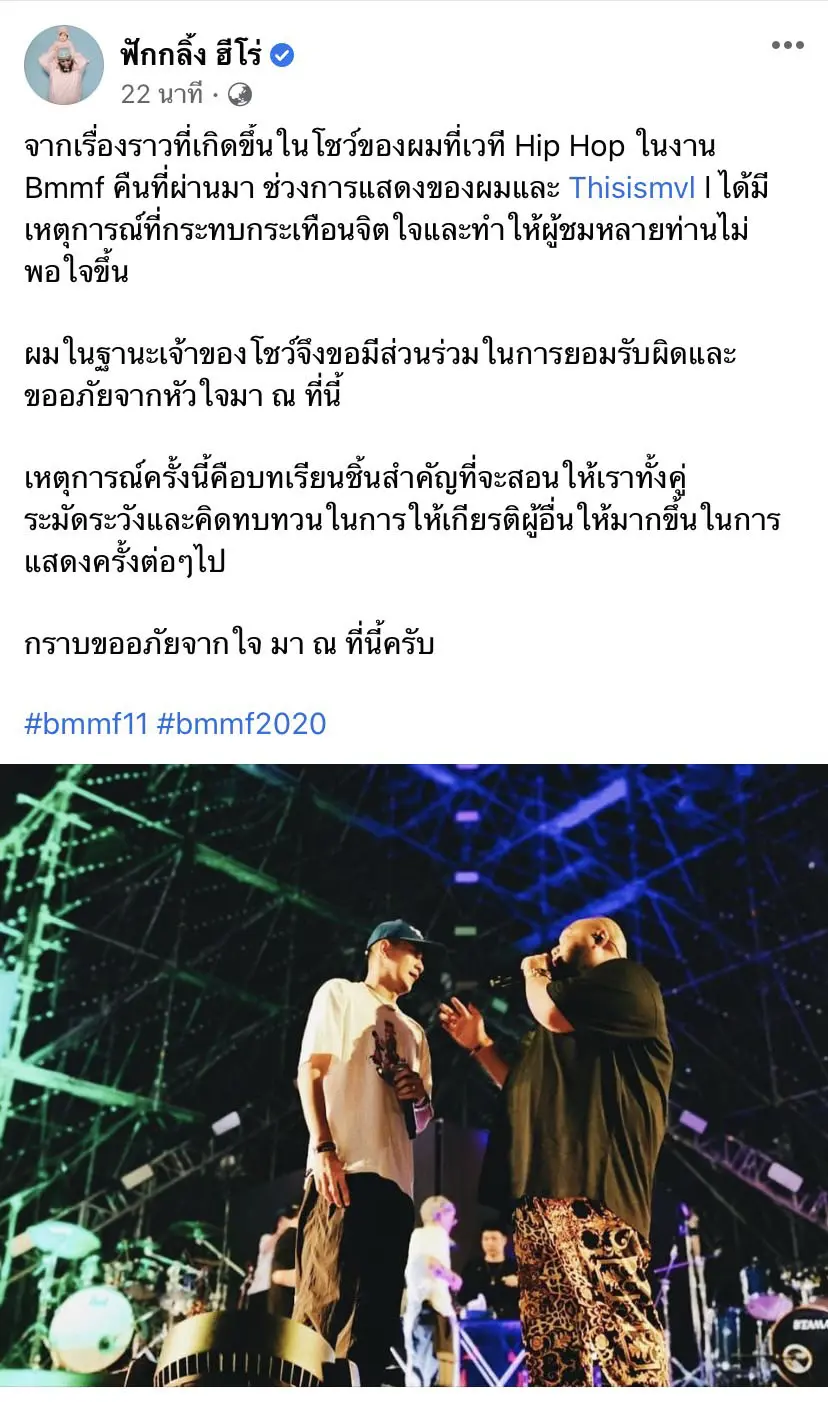 โดยได้มีคนดูได้ออกมาโพสต์ลงในเฟซบุ๊กส่วนตัวถึงความไม่เหมาะสมนี้ โดยได้ระบุว่า “เป้ วงมายด์ พูดบนเวทีที่ F.HERO เล่นว่า อย่าแสวงหารักแท้ ถ้าหน้ากับนมมึงยังปลอม จบกันจบกัน” ซึ่งก็ได้มีคนมาคอมเมนต์แสดงความคิดเห็นกันยกใหญ่ถึงความไม่เหมาะสมนี้ รวมถึงมีการโยงไปถึงภรรยาของเป้เองด้วย จนทำให้เป้ต้องออกมาขอโทษลงในไอจีส่วนตัวว่า “จากเหตุการณืในงาน BMMF11 ที่เกิดขึ้นในระหว่างการโชว์บนเวที กับคำพูดที่ไม่เหมาะสมที่ผมได้พูดออกไปนั้น ผมอยากแสดงความเสียใจต่อสิ่งที่ผมได้พูดออกไปโดยไม่ทันได้คิดให้ถี่ถ้วน ว่าจะไปกระทบต่อความรู้สึกของผู้อื่น ครั้งนี้เป็นบทเรียนความผิดพลาดที่ผมจะนำไปแก้ไขปรับปรุงตัวเอง หลังจากนี้ผมจะคิดไตร่ตรองให้ดีก่อนพูดทุกครั้ง และขอให้พื้นที่ตรงนี้ ยอมรับผิดและขอโทษทุกคนจากใจจริงครับ”