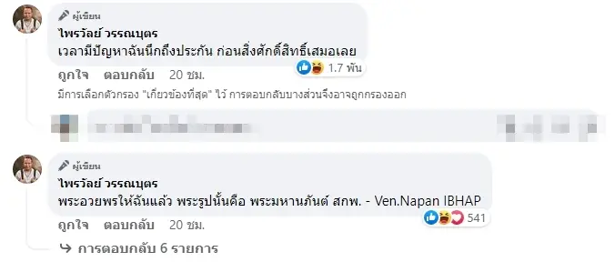 แล้วในคอมเมนต์ของโพสต์นี้ เจ้าตัวยังได้มีการพูดเสริมเอาไว้อีกว่า “เวลามีปัญหาฉันนึกถึงประกัน ก่อนสิ่งศักดิ์สิทธิ์เสมอเลย” ข้อความนี้ก็ได้รับกดไลก์ไปมากกว่า 1000 ครั้ง