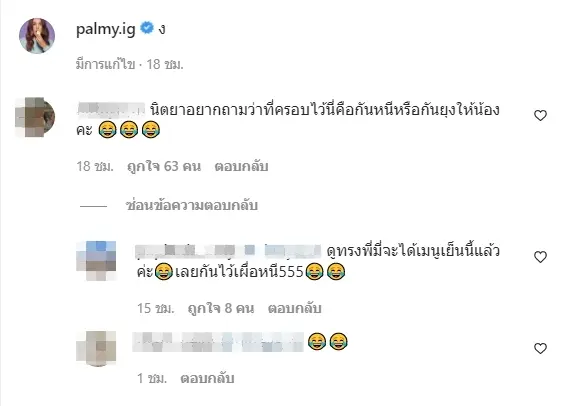 ชาวเน็ตจำนวนไม่น้อย เข้ามาคอมเมนต์ใต้โพสต์ถึงความใจกล้าของปาล์มมี่ ที่ดูเหมือนจะไม่รู้สึกอะไรเลยด้วยซ้ำ คงมาดนิ่ง ๆ คูล ๆ ของตัวเองได้เป็นอย่างดี บางก็เข้ามาแซวว่า ได้มื้อเย็นแล้ว หรือมีบางส่วนที่ถามหาเลขที่บ้านของปาล์มมี่กันเลย