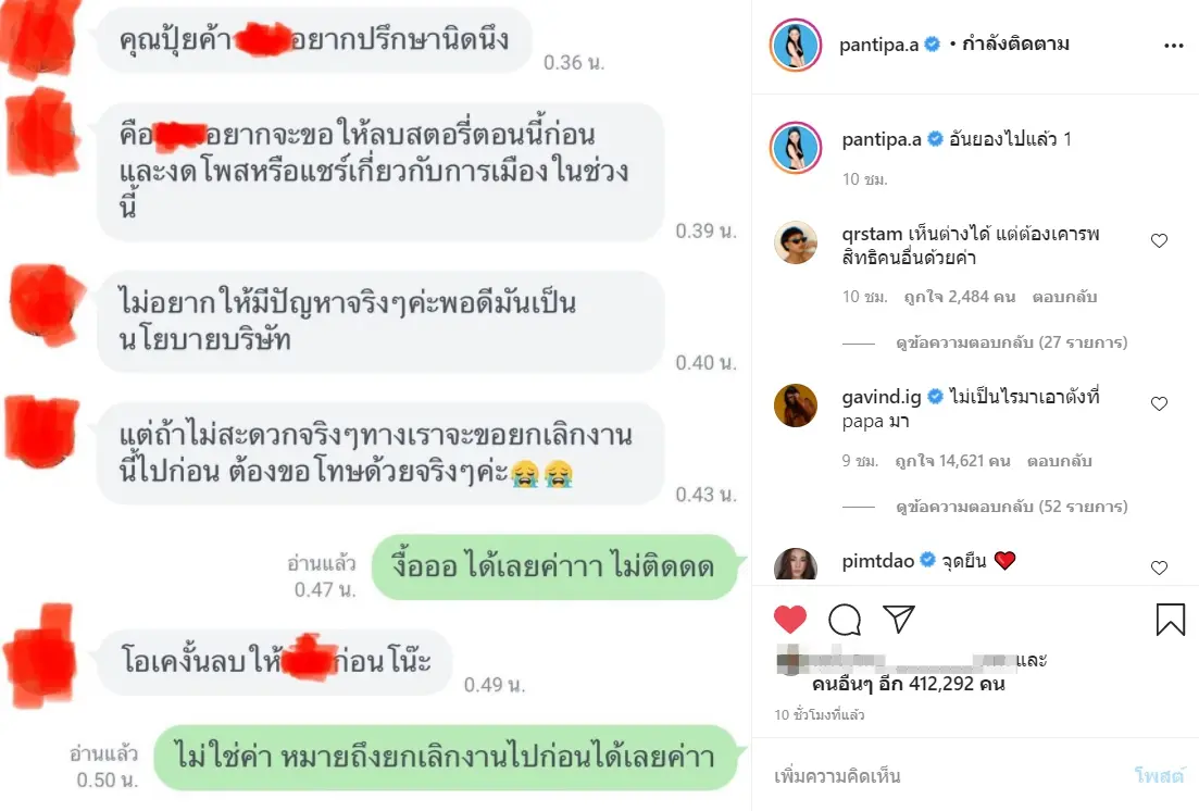 เป็นอีกหนึ่งคนบันเทิงที่ออกมาเเสดงจุดยืนทางการเมืองสำหรับ ปุ้มปุ้ย พรรณทิพา ภรรยาสุดที่รักของแร็ปเปอร์หนุ่ม กวิน ดูวาล ที่หลังจากเหตุการณ์สลายการชุมนุมเมื่อคืนของวันที่ 16 ตุลาคม ที่ผ่านมา เจ้าตัวก็ได้ออกมาโพสต์ข้อความการสนทนาระหว่างผู้ดูเเลเเบรนด์สินค้าที่เจ้าตัวเป็นพรีเซนเตอร์ หรือ เป็นผู้รีวิวอยู่ โดยเนื้อหาข้อความ ปุ้มปุ้ย ได้ประกาศเเล้วว่า ไม่ได้สนใจแบรนด์สินค้าเเต่อย่างไร หากจะบังคับไม่ให้แสดงออกทางการเมือง เจ้าตัวก็เลยขอ Say good bye เช่นกัน