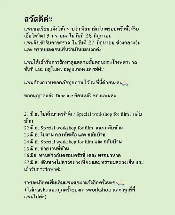 แพนเค้ก ได้มีการแจงไทม์ไลน์ย้อนหลังก่อนทราบว่าติดเชื้อโควิด19 ดังนี้ “สวัสดีค่ะ แพนขอเรียนแจ้งให้ทราบว่า มีสมาชิกในครอบครัวที่ได้รับเชื้อโควิด 19 ทราบผลในวันที่ 26 มิถุนายน แพนจึงเข้ารับการตรวจ ในวันที่ 27 มิถุนายน ช่วงกลางวันและ ทราบผลตอนเย็นว่าเป็นผลบวกค่ะ แพนได้เข้ารับการรักษาดูแลตามขั้นตอนของโรงพยาบาลทันที และ อยู่ในความดูแลของแพทย์ค่ะ แพนต้องกราบขออภัยทุกท่าน ไว้ ณ ที่นี้ด้วยนะคะ.