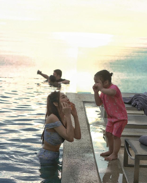 ล่าสุด สาวเป้ยก็ทำเอาชาวเน็ตยิ้มแก้มปริกันอีกครั้ง โดยในคราวนี้ เธอขอควงน้องปาลินมาทำท่าจับแก้มกลมๆ กันเสียหน่อย งานนี้นอกจากนางแบบทั้ง 2 คนจะน่ารักแล้ว แต่ภาพเบื้องหลังที่เป็นฉากพระอาทิตย์กำลังตกก็สวยสุดๆ ไปเลย ทำเอาทั้งเพื่อนในวงการอย่างสาวกุ๊บกิ๊บ และเหล่าชาวเน็ตอดใจไม่ไหวต้องมาคอมเมนต์ชมกันเสียยกใหญ่