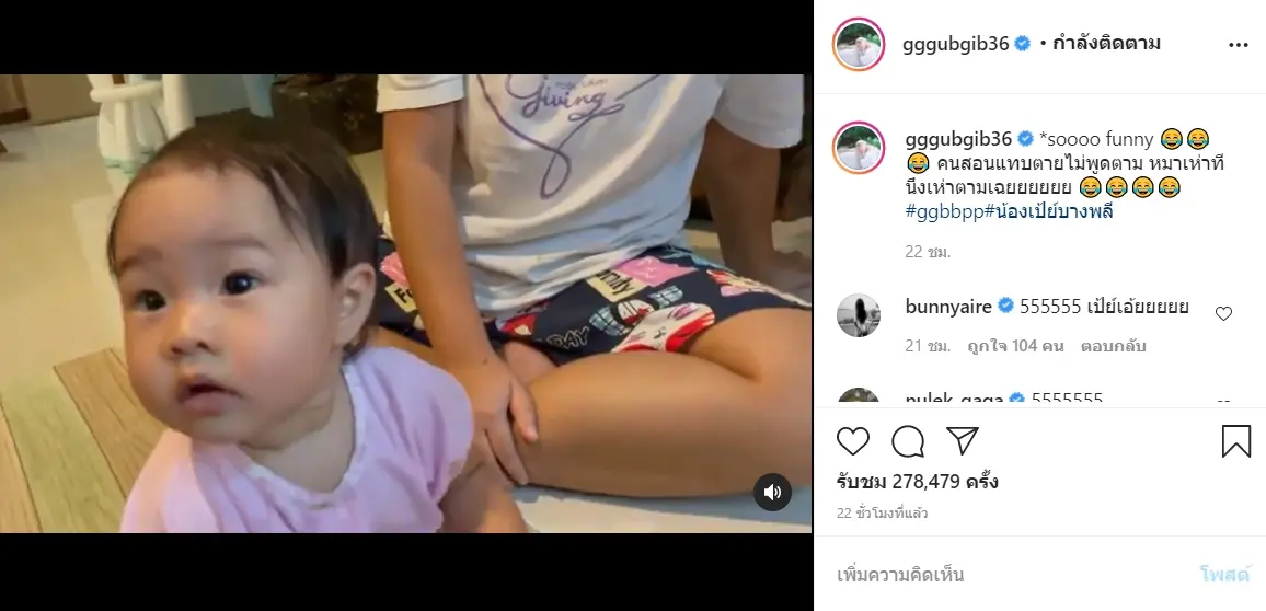 โดยล่าสุด น้องเป่าเป้ย์ก็ยังอยู่ในช่วงวัยหัดพูด แต่เป็นลูกสาวแม่กุ๊บกิ๊บทั้งที จะให้ธรรมดาได้ไง น้องเป่าเป้ย์เลยขอพูดไว้โอกาสหน้า จุดนี้ขอเลียนเสียงเห่าบ๊อก ๆ ของน้องหมาไปก่อน ซึ่งสาวกุ๊บกิ๊บก็ได้โพสต์คลิปน้องเป่าเป้ย์ทำเสียงเห่าพร้อมแคปชั่นว่า ‘*soooo funny ??? คนสอนแทบตายไม่พูดตาม หมาเห่าทีนึงเห่าตามเฉยยยยยย ???? ggbbpp น้องเป้ย์บางพลี’