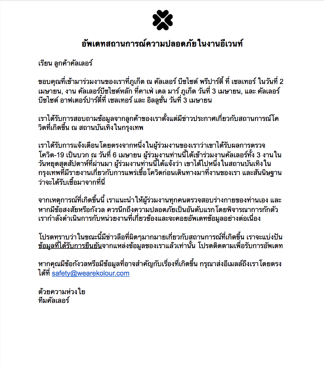 ล่าสุด วันที่ 7 เมษายน 2564 เฟซบุ๊ก Kolour ทีมจัดงานอีเวนต์คัลเลอร์ที่ จ.ภูเก็ต ตั้งแต่วันที่ 2-3 เมษายน ที่ผ่านมา ได้ออกมาประกาถึงผู้ร่วมงานรายหนึ่งได้ติดเชื้อโควิด-19 และก่อนหน้านี้ก็เคยไปสถานบันเทิงในกรุงเทพฯ ทำให้สันนิษฐานได้ว่า รับเชื้อมาจากที่นี่