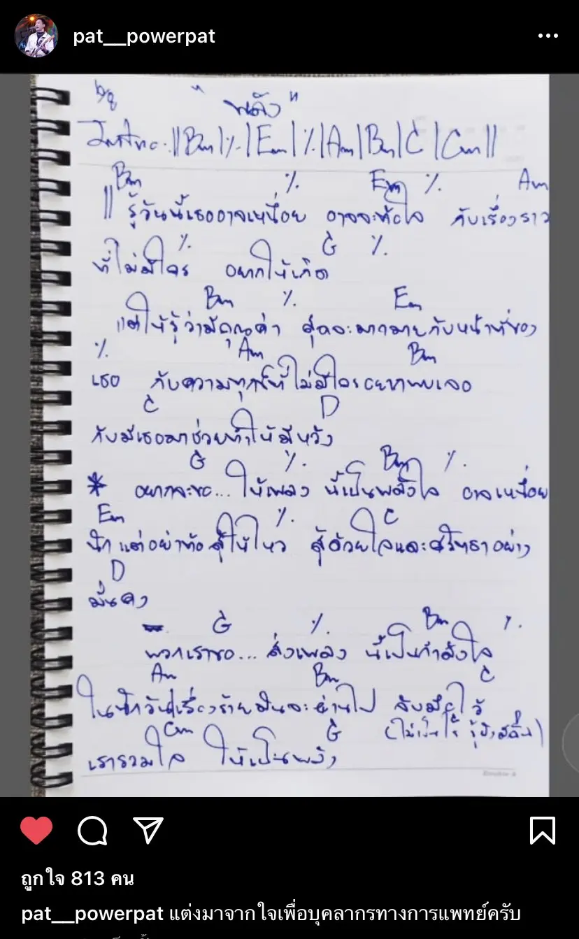 ล่าสุด แด๊ดดี้ แพท พาวเวอร์แพท ก็เป็นอีกหนึ่งรายที่ได้มีการส่งกำลังใจไปยังทีมแพทย์ ด้วยการแต่งเพลงที่มีชื่อว่า “พลัง” พร้อมระบุข้อความว่า “แต่งมาจากใจเพื่อบุคลากรทางการแพทย์ครับ” เชื่อว่าอีกไม่นานทุกคนคงได้ฟังกันอย่างแน่นอน