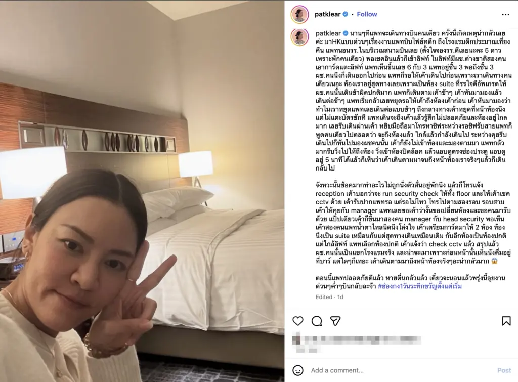 “แพท วง Klear” เล่าเหตุระทึกที่ฮ่องกง เจอชายแปลกหน้าเดินตามถึงหน้าห้อง ฝากเตือนสาวๆ เดินทางคนเดียวให้ระวังตัว