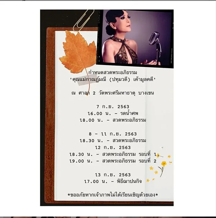 โดยกำหนดการสวดพระอภิธรรม จะจัดขึ้น วััดพระศรีมหาธาตุ บางเขน วันที่ 7 กันยายน 2563