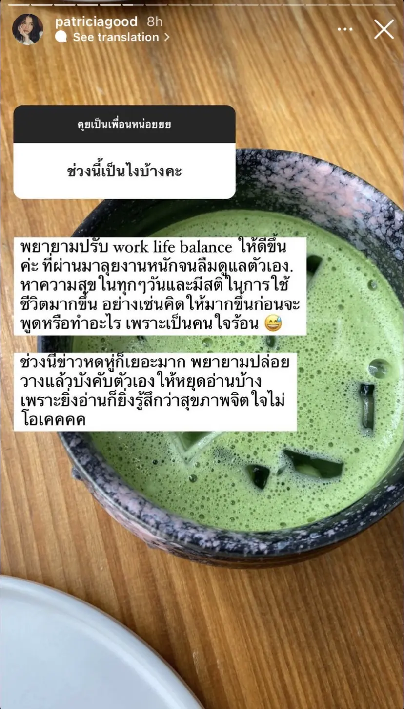 ช่วงนี้เป็นยังไงบ้างคะ ซึ่งด้าน แพทริเซีย ก็ได้มีการตอบกลับว่า พยายามปรับ work life balance ให้ดีขึ้นค่ะ ที่ผ่านมาลุยงานหนักจนลืมดูแลตัวเอง. หาความสุขในทุกๆวันและมีสติในการใช้ชีวิตมากขึ้น อย่างเช่นคิดให้มากขึ้นก่อนจะพูดหรือทำอะไร เพราะเป็นคนใจร้อน ช่วงนี้ข่าวหดหู่ก็เยอะมาก พยายามปล่อยวางแล้วบังคับตัวเองให้หยุดอ่านบ้าง เพราะยิ่งอ่านก็ยิ่งรู้สึกว่าสุขภาพจิตใจไม่โอเค