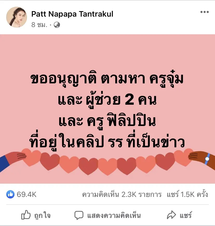 ต่อมาเจ้าตัวก็ได้โพสต์ข้อความต่างๆตามมาเรื่อยๆว่า “ขออนุญาติตามหาครูจุ๋ม และ ผู้ช่วย 2 คน และครูฟิลิปปินส์” , “ปิดโรงเรียนเถอะ คุณพระ !!!” , “รร อะไรวะเนี่ย” , “เอาไงดี จัดคนไหนก่อน” ซึ่งเจ้าตัวก็ได้ตอบคอมเมนต์ชาวเน็ตที่บอกว่าครูดังกล่าวอยู่แถวบ้านว่า “ตรงไหนเดี๋ยวแพทไป “