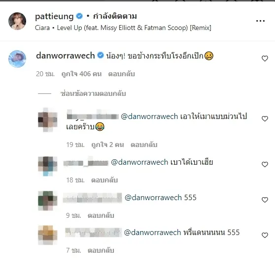 มีคนเข้ามาคอมเมนต์ให้กับสดใสของแพตตี้กันเป็นจำนวนมาก แต่มีทางด้าน แดน วรเวช ที่เข้ามาแซวแฟนสาวตัวอย่างออกรสออกชาติ ว่างานนี้ดีดมาจากไหน ขอม้ากระทืบโรงเพิ่มอีกสักทีน่าจะโอเค