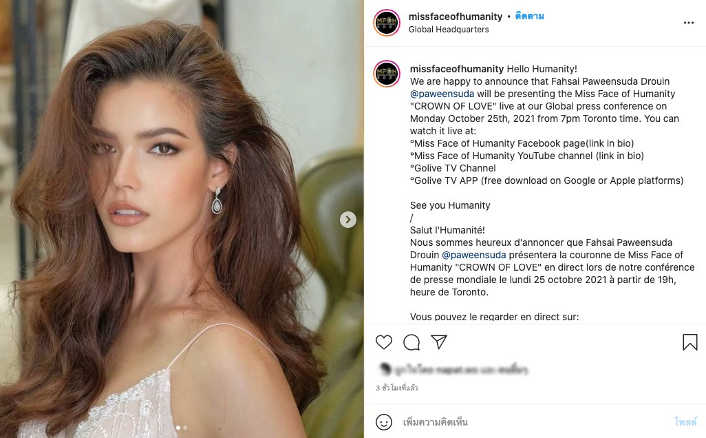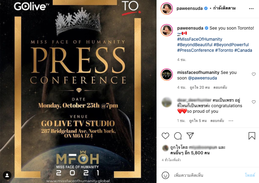 ในขณะเดียวกันไอจีของกองก็โพสต์ภาพของฟ้าใส พร้อมประกาศว่า ฟ้าใส จะเดินทางมาร่วมในงานแถลงข่าวระดับโลกในวันจันทร์ที่ 25 ตุลาคม 2564 ตั้งแต่เวลา 19.00 น. ตามเวลาโตรอนโต งานนี้ก็ต้องจับตาดูกันว่าเธอเดินทางข้ามประเทศไปไกลขนาดนี้ จะไปอยู่ตำแหน่งใดในงานแถลงข่าว