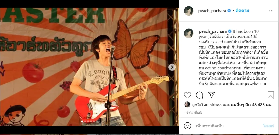 โดยโพสต์ล่าสุด ที่พีชได้โพสต์นั้นคือเรื่องที่ครบรอบ 10 ปีการเป็นนักแสดง และ ครอรอบของภาพยนตร์เรื่อง SuckSeed ห่วยขั้นเทพ ซึ่งระบุว่า