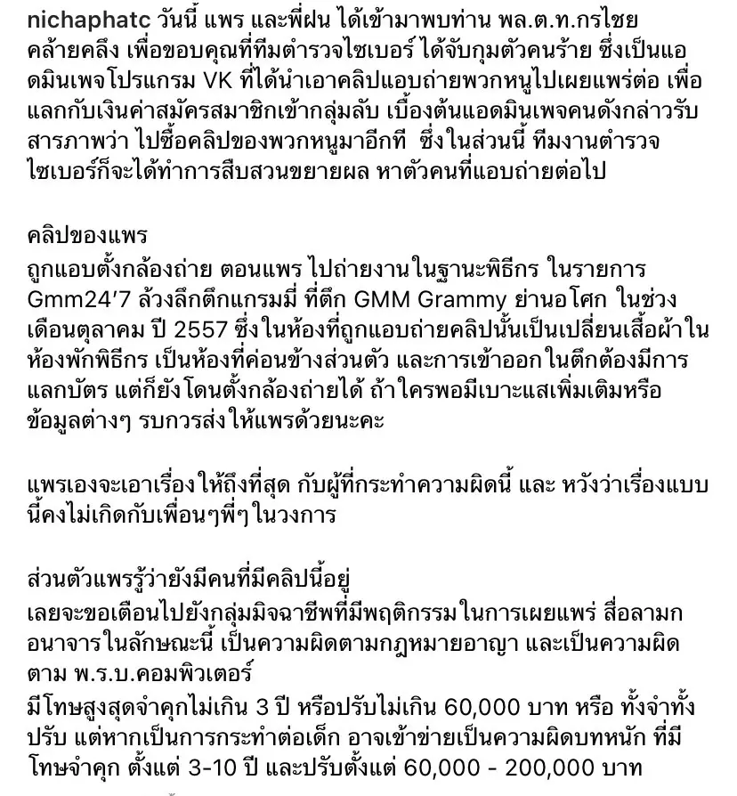แพรวา ณิชาภัทร และ ฝน ศนันธฉัตร เข้าพบเจ้าหน้าที่ตำรวจไซเบอร์หลังมีความคืบหน้าจากเหตุการณ์ที่ทั้ง2 ถูกปล่อยคลิปที่โดนแอบถ่ายจากตึกดังย่านอโศก