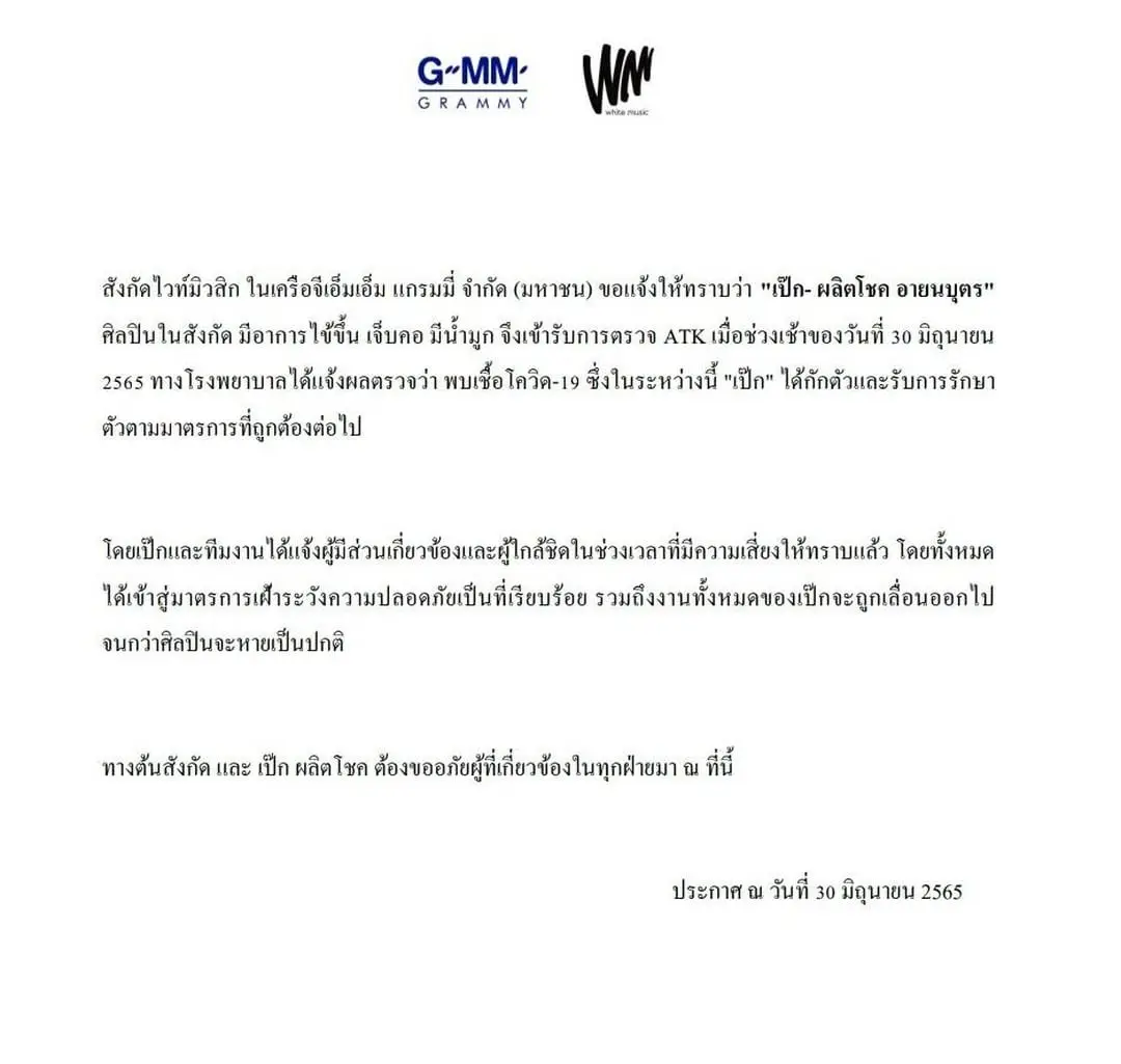 “ไวท์มิวสิก ในเครือจีเอ็มเอ็ม แกรมมี่ จำกัด (มหาชน) ขอแจ้งให้ทราบว่า เป๊ก – ผลิตโชค อายนบุตร ศิลปินในสังกัด มีอาการไข้ขึ้น เจ็บคอ มีน้ำมูก จึงเข้ารับการตรวจ ATK เมื่อช่วงเช้าของวันที่ 30 มิถุนายน 2565 ทางโรงพยาบาลได้แจ้งผลตรวจว่า พบเชื้อโควิด-19 ซึ่งในระหว่างนี้ “เป๊ก” ได้กักตัวและรับการรักษาตัวตามมาตรการที่ถูกต้องต่อไป