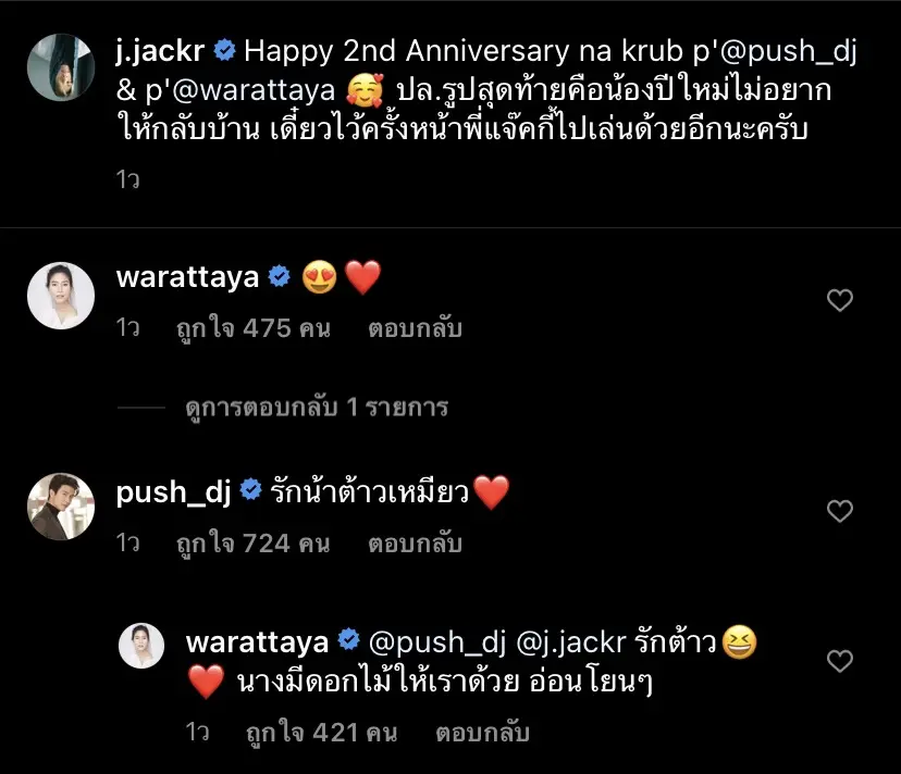 ที่ต้องโฟกัสก็คือ น้องปีใหม่นั้น น่าเอ็นดูหนักมาก! ซึ่งหนุ่มแจ๊คกี้ ก็ได้มีการโพสต์ภาพ พร้อมข้อความว่า “Happy 2nd Anniversary na krub p’@push_dj & p’@warattaya ? ปล.รูปสุดท้ายคือน้องปีใหม่ไม่อยากให้กลับบ้าน เดี๋ยวไว้ครั้งหน้าพี่แจ๊คกี้ไปเล่นด้วยอีกนะครับ”