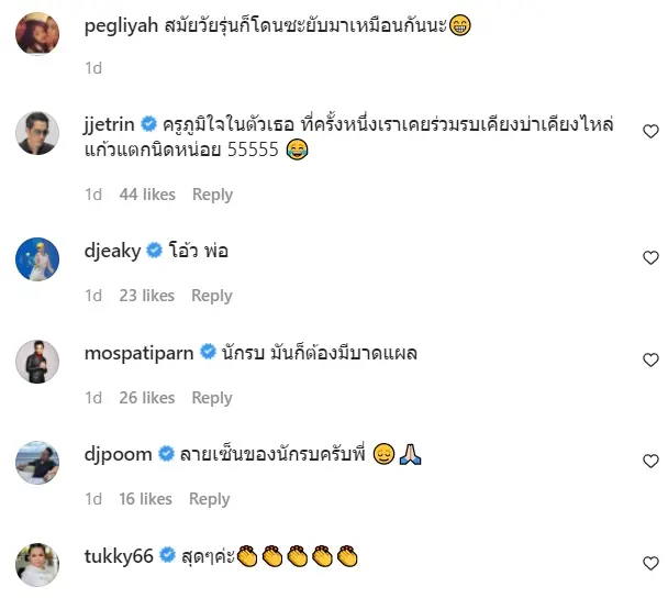 เรียกได้ว่างานนี้ทำเอาบรรดาเพื่อนคนบันเทิงต่างเข้ามาคอมเมนต์กันอย่างไวนำทีมโดย เจ เจตริน ,มอส ปฏิภาณ และ ดีเจเอกกี้ ต่างเข้ามาแซวกันอย่างคึกคักเลยทีเดียว