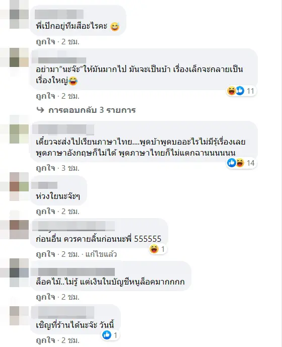 แต่ที่ดุเดือดไม่แพ้กันเห็นจะเป็นทางฝั่งคอมเมนต์ใต้โพสต์ของหนุ่มเป๊ก ที่ปั่นจัดไม่แพ้ต้นทางเลยทีเดียว ทั้ง ‘อย่ามา”นะจ๊ะ”ให้มันมากไป มันจะเป็นบ้า เรื่องเล็กจะกลายเป็นเรื่องใหญ่?’, ‘เดี๋ยวจะส่งไปเรียนภาษาไทย….พูดบ้าพูดบออะไรไม่มีรุ้เรื่องเลย พูดภาษาอังกฤษก็ไม่ได้ พูดภาษาไทยก็ไม่แตกฉานนนนนน’, ‘เอาจริงๆถ้า ไม่มีลิ้นนี้คืออาจฟังรู้เรื่องกว่านี้ไหม ไม่รู้จะโทษลิ้นหรือสมองดี’, ‘วุฒิภาวะของคนเป็นผู้นำนี่สำคัญจริงๆ’