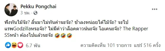 ‘ฟังทันไม๊จ๊ะ? ลิ้นมาไม่ทันคำนะจ๊ะ? ช้าลงหน่อยได้ไม๊จ๊ะ? จะไปแรพGodzillaหรอจ๊ะ? ไม่มีคำว่าล็อคดาวน์นะจ๊ะ โอเคนะจ๊ะ? The Rapper SSหน้า ต้องไปแล้วนะจ๊ะ ???’