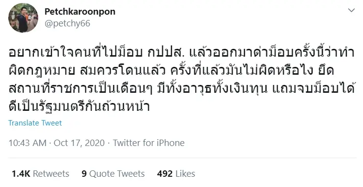 ล่าสุด เพชร กรุณพล ออกมาเเสดงความคิดเห็น ผ่านทวิตเตอร์ส่วนตัวว่า “อยากเข้าใจคนที่ไปม็อบ กปปส. แล้วออกมาด่าม็อบครั้งนี้ว่าทำผิดกฎหมาย สมควรโดนแล้ว ครั้งที่แล้วมันไม่ผิดหรือไง ยึดสถานที่ราชการเป็นเดือนๆ มีทั้งอาวุธทั้งเงินทุน แถมจบม็อบได้ดีเป็นรัฐมนตรีกันถ้วนหน้า”