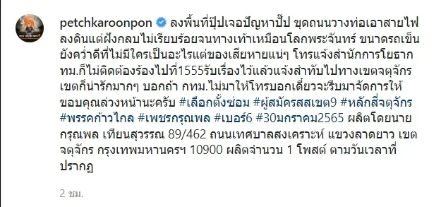 แต่ในการลงพื้นที่ครั้งล่าสุด ก็ทำให้เจ้าตัวได้เจอกับปัญหาของคนในพื้นที่แบบต่อหน้าต่อตาเลยทีเดียว จากปัญหาที่ก่อนหน้านี้ได้มีการขุดพื้นเพียงนำสายลงใต้ดิน แต่หลังจากเสร็จสิ้น พื้นผิวบริเวณนั้นกลับไม่ได้รับการดูแลให้กลับมาอยู่ในสภาพเดิมที่พร้อมใช้งาน เจ้าตัวบอกว่า คล้ายกับพื้นดวงจันทร์ จนทำให้ผู้คนที่ต้องสัญจรผ่านทางนี้ไม่ได้รับความสะดวกสบาย