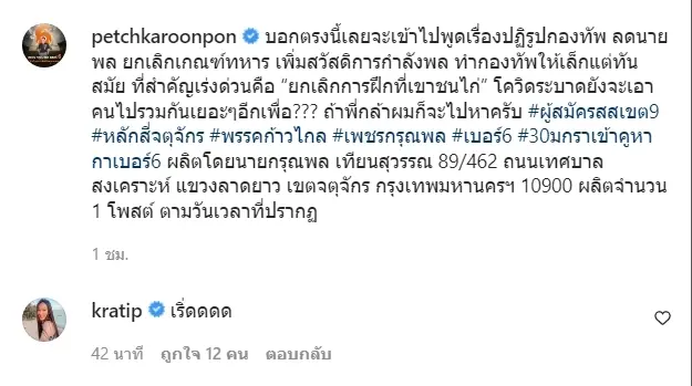 ซึ่งเจ้าตัวก็ได้โพสต์ไว้อีกว่า การเข้าไปหาเสียงครั้งนี้ ต้องการที่จะเสียงพูดถึงเรื่องของการปฏิรูปกองทัพ ลดนายพล ยกเลิกเกณฑ์ทหาร เพิ่มสวัสดิการกำลังพล ทำกองทัพให้เล็กแต่ทันสมัย ที่สำคัญเร่งด่วนคือ “ยกเลิกการฝึกที่เขาชนไก่” ที่ตอนนี้มีการะบาดของโควิด-19 แค่ก็ยังคงมีการให้นักเรียน ร.ด. เข้ารับการฝึกอย่างต่อเนื่อง