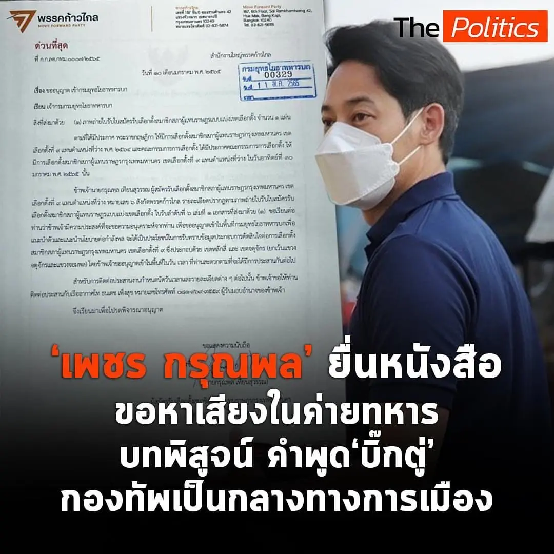 เพชร กรุณพล ผู้สมัครส.ส เลือกตั้งซ่อมเขต9 ยื่นจดหมายถึงเจ้ากรมกรมยุทะโยธาทหารบก ขอเข้าหาเสียงในค่ายทหาร พิสูจน์คำพูดของ พลเอกฯ ประยุทธ ว่า “กองทัพเป็นกลางทางการเมือง”