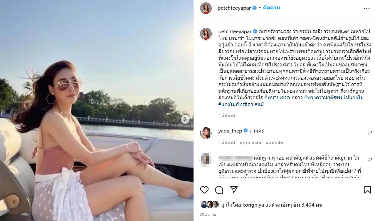 หากย้อนไปเมื่อวันที่ 30 มีนาคมที่ผ่านมา เจ้าตัวก็ได้โพสต์ภาพของ แตงโม นิดา ปมกระโปรงสีขาวหายไปว่า อยากรู้ความจริง ว่า กระโปรงสีขาวของพี่แตงโมหายไปไหน เพชรว่า ไม่น่าจะยากค่ะ ตอนที่เค้าเจอศพมีคนถ่ายคลิปถ่ายรูปไว้เยอะอยู่แล้ว ตอนนี้ ถึงเวลาที่ต้องเอามายืนยันแล้วค่ะ ว่า ศพพี่แตงโมใส่กระโปรงสีขาวอยู่หรือเปล่าหรือจมหายไปเพราะเพชรติดตามข่าวมาพบว่าเสื้อสีครีมที่พี่แตงโมใส่คลุมอยู่นั้นตอนเจอศพก็ยังอยู่ด้วยแต่เสื้อใส่ทับกระโปรงอีกทีนึงมันเป็นไปไม่ได้เลยที่กระโปรงจะหายไปค่ะ พี่แตงโมเป็นคนของประชาชนเป็นบุคคลสาธารณะประชาชนทุกคนควรมีสิทธิ์ที่จะทราบความเป็นจริงเกี่ยวกับการเสียชีวิตค่ะ ส่วนตัวเพชรคิดว่าจะต้องเจอร่องรอยอะไรบางอย่างในกระโปรงตัวนั้นอย่างแน่นอนอย่างที่คุณหมอพรทิพย์สันนิษฐานไว้ การที่หลักฐานที่เกี่ยวข้องกับบดีหายไปต้องตามหาค่ะไม่ใช่พูดว่า”ถึงหลักฐานล่องหนก็ไม่เกี่ยวอะไร
