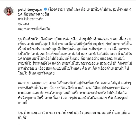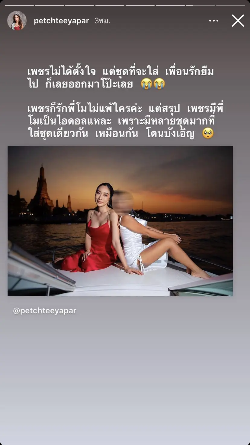 ต่อมาเจ้าตัวก็โพสต์รูปภาพในชุดสีแดงบนเรือสปีดโบ๊ทอีกครั้ง ซึ่งก็โดนวิจารณ์อีกว่า เป็นชุดที่คล้ายชุดสีแดงที่แตงโม เคยใส่ไปลงเรือกับ แอนนา มาแล้วเหมือนกัน