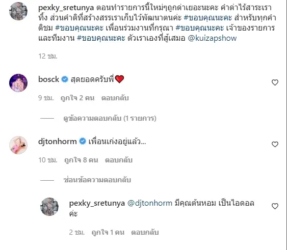 แต่ที่เปลี่ยนไปในครั้งนี้ เจ้าตัวได้รับคำชมผ่านทางโซเชียลเพิ่มขึ้นเป็นจำนวนมาก ถึงการเป็นพิธีกรในครั้งนี้ ทำให้เจ้าตัวรู้สึกตื้นตันใจ โพสต์ข้อความขอบคุณทุก ๆ คน ที่คอยเป็นกำลังใจ ขอบคุณทีมงานรายการและเพื่นอร่วมงานทุกคน โดยบอกว่า ตอนทำรายการนี้ใหม่ ๆ ถูกด่าเยอะ คำด่าไร้สาระเราทิ้ง ส่วนคำติที่สร้างสรรเราเก็บไว้พัฒนาตน จนได้รับชมในที่สุด