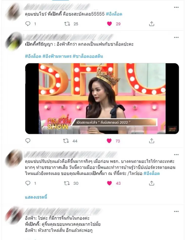 ล่าสุด ทางรายการได้มีการเชิญแขกรับเชิญอย่าง ทีมมิสแกรนด์ไทยแลนด์2022 มาร่วมออกรายการหลังจากการประกวดจบลง โดยมี เป็กกี้ เป็นหนึ่งในพิธีกรของวันนี้ ซึ่งเจ้าตัวก็ทำหน้าที่สัมภาษณ์แขกรับเชิญตามปกติ