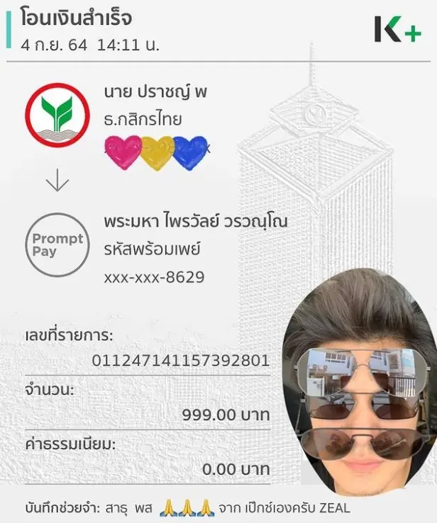 ล่าสุด เป๊ก วงซีล หรือ ปราชญ์ พงษ์ไชย ได้มีการโพสต์ภาพสลิปการโอนเงิน จำนวน 999 บาท ไปยังบัญชี พระมหา ไพรวัลย วรวณฺโณ ซึ่งในสลิปการโอนเงิน เป๊ก ได้มีการระบุข้อความตรงช่องบันทึกช่วยจำว่า สาธุ พส (อิโมจิยกมือไหว้ 3 ตัว) จาก เป๊กซ์เองครับ ZEAL พร้อมระบุแคปชันว่า ธรรมะบันเทิง มันทำให้เราใกล้ชิดกับธรรมะจริงๆนะ ในมุมของชาวพุทธ พุทธยัวแฮนซัพ 😂🙏🙏🙏 ซึ่งก็ได้มีบรรดาแฟนๆต่างแห่คอมเมนต์คำว่า สาธุ กันเป็นจำนวนมาก