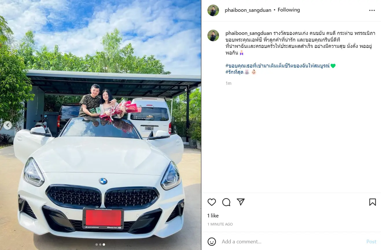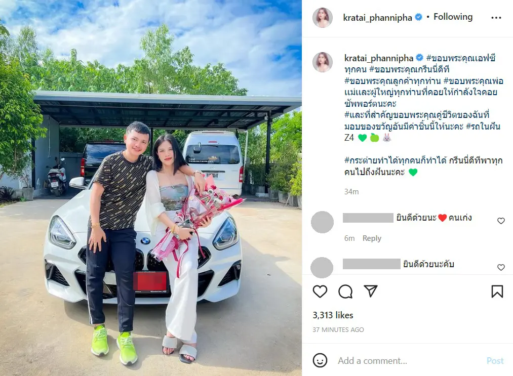ขณะที่กระต่ายเองก็มีการโพสต์ภาพในวันรับรถด้วยรอยยิ้มแห่งความสุข พร้อมเขียนแคปชั่นถึงคุณสามีด้วยว่า “ขอบพระคุณคู่ชีวิตของฉันที่มอบของขวัญอันมีค่าชิ้นนี้ให้นะคะ #รถในฝัน Z4”