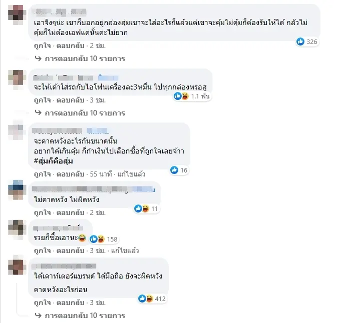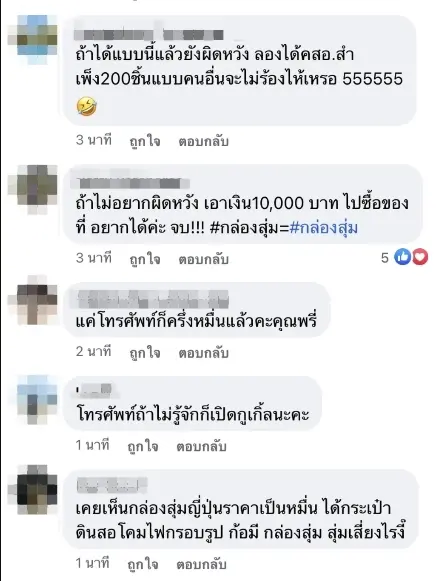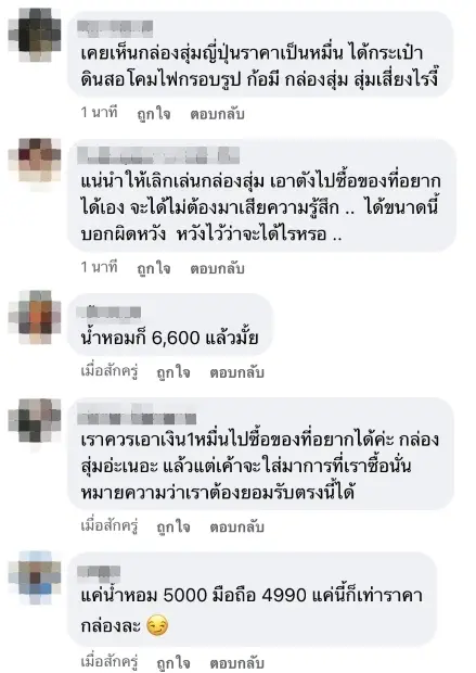 งานนี้ทำเอาคนในโลกโซเชียลวิจารณ์กันสนั่น ถึงคำว่า ผิดหวัง ของพิม โดยส่วนใหญ่ก็แสดงความคิดว่า กล่องสุ่มก็การสุ่มสินค้า ราคาน้ำหอมก็เกิน5,000บาทแล้ว ส่วนโทรศัพท์มือถือที่เจ้าไม่รู้จัก ก็ราคากว่า 5,000บาท ไม่ได้รู้จักไม่ได้หมายความไม่คุ้ม บ้างก็ว่า ถ้าอยากให้คุ้มก็ให้นำเงินที่ซื้อกล่องสุ่ม ไปซื้อสินค้าที่อยากได้อยู่แล้วดีกว่า กล่องสุ่มก็คือสุ่มเสี่ยง